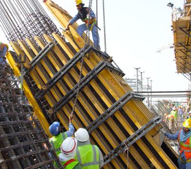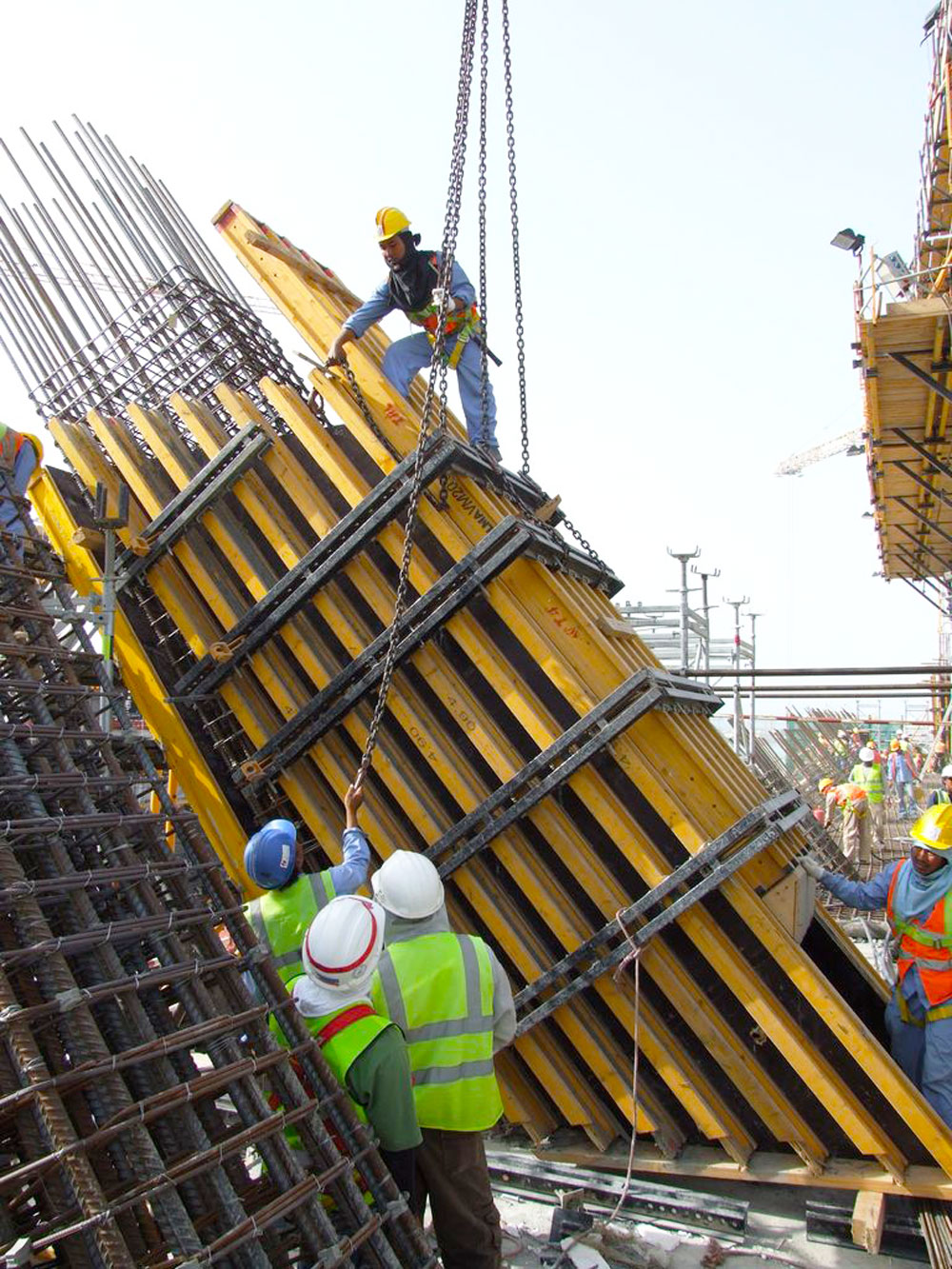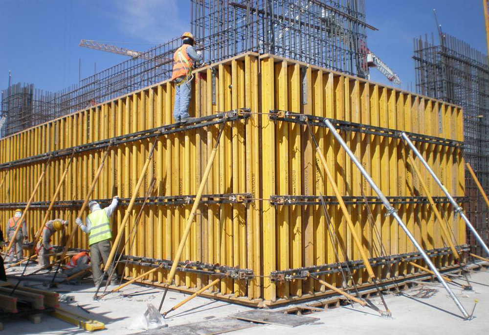 Le pareti di sostegno e quelle con inclinazione variabile, così come le strutture centrali, sono state realizzate con la cassaforma verticale ENKOFORM V-100. Questo sistema ha fornito una soluzione per la costruzione di varie strutture aventi geometrie diverse con ottimi risultati in termini di prestazioni e finiture eccellenti. Utilizzando componenti standard, traverse metalliche e travi in legno, sono stati realizzati pennelli su misura che hanno consentito la realizzazione delle complesse configurazioni previste dal progetto.