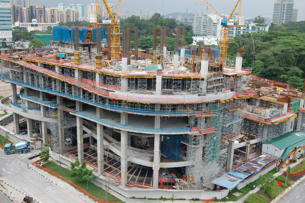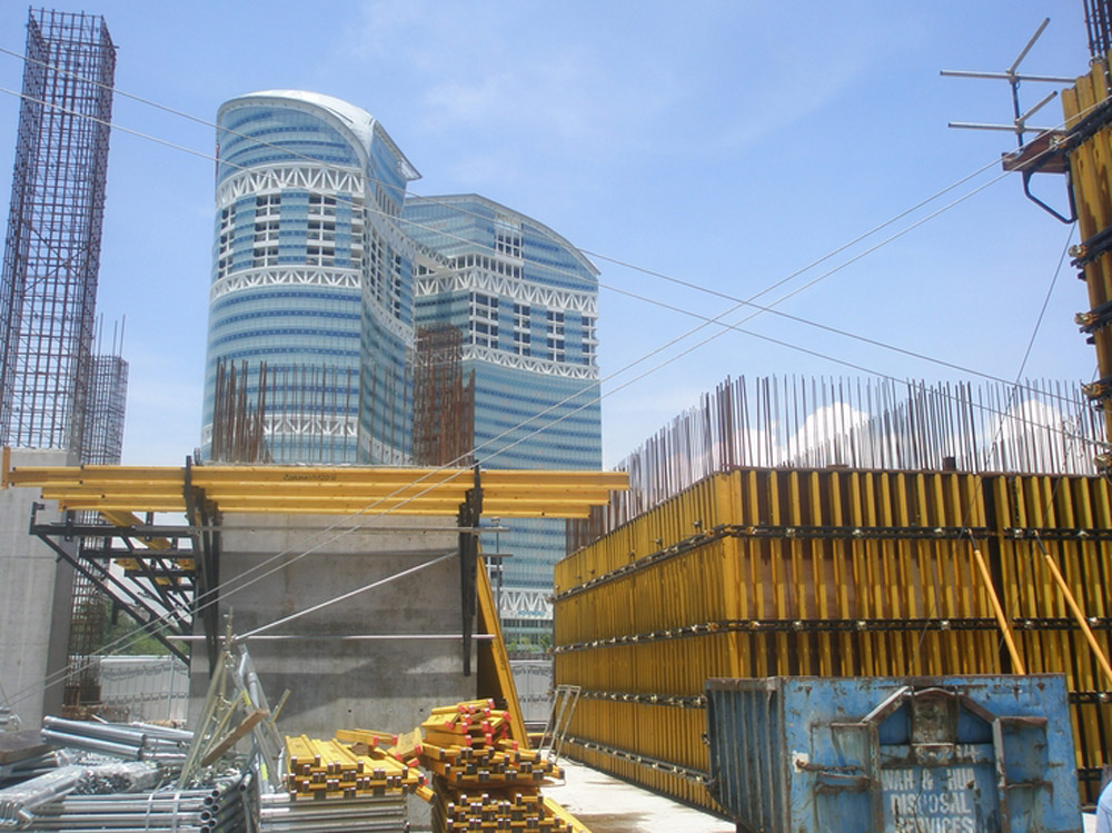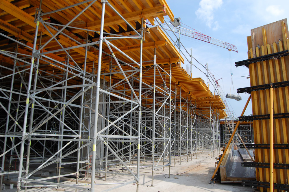 I solai e le travi sospese presenti sui piani standard sono stati realizzati con tavoli VR e puntelli EP la cui gamma ha consentito l'adattamento alle diverse altezze di ciascun piano. Questa cassaforma orizzontale si è dimostrata la soluzione ideale per tutti i solai e ha consentito l'assemblaggio veloce con tempi minimi per la movimentazione in cantiere. Sui primi tre piani, di 11m ciascuno, sono stati utilizzati tavoli VR e il sistema T-60 insieme alla cassaforma orizzontale ENKOFLEX.