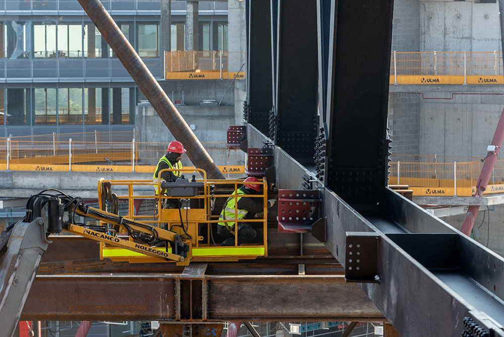 La soluzione proposta da Ulma ha risposto perfettamente a questa richiesta: sono stati forniti circa 900 metri di protezioni perimetrali progettate ad hoc, costituite da centine MK accoppiate tra loro mediante l’ausilio di tubi da ponteggio; fissate al solaio appena realizzato, hanno permesso la casseratura e la realizzazione del solaio successivo in totale sicurezza.