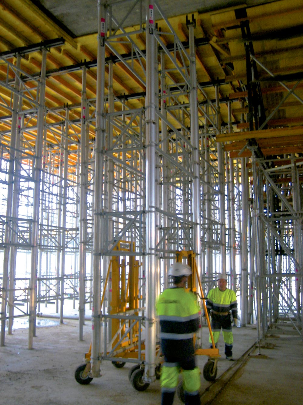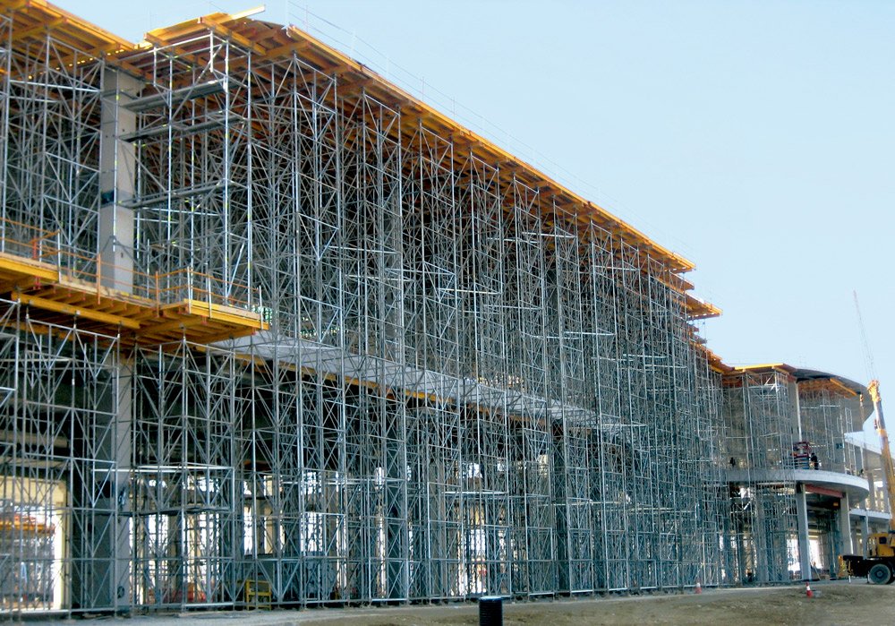 Visti gli elevati ritmi di esecuzione e le scadenze molto strette, alcuni lavori sono stati svolti contemporaneamente. Se da un lato si procedeva ad ultimare l'ultima opera in quota, ovvero l'assemblaggio della struttura metallica, sulla sezione inferiore si iniziavano i lavori per l'installazione delle facciate in vetro. Per evitare il pericolo di caduta di materiale, è stata progettata una copertura protettiva con l'ausilio del sistema BRIO, un ponteggio sicuro e multiuso, in grado di sostenere tutti i tipi di puntelli, da quelli leggeri ai più pesanti. Grazie a questa soluzione, è stato possibile operare in quota con la garanzia di tutte le misure di sicurezza.