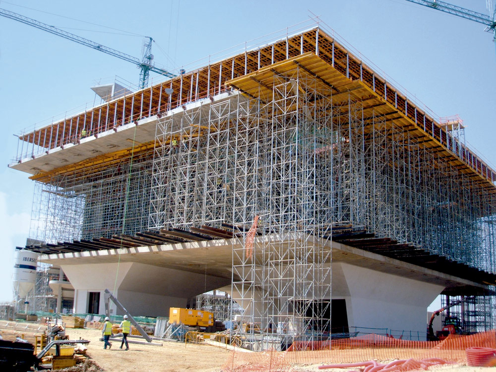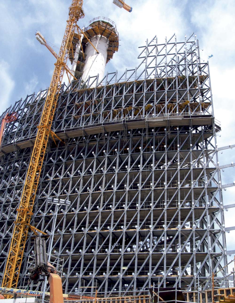 La colonna portante del progetto è rappresentata dalle due parti centrali separate da una distanza di 20m in modo da consentire il sostegno della facciata in vetro da 8.000m2. Per questo edificio molto particolare sono state progettate soluzioni molto specifiche. Le complesse forme arrotondate sono state realizzate grazie all'uso di una cassaforma costruita appositamente per questo progetto. Questi prodotti sono stati utilizzati su sistemi rampanti per raggiungere la quota di 70m. Le opere eseguite in quota hanno richiesto piccole piattaforme intermedie, complete di strutture di sostegno e del ponteggio modulare BRIO, mantenendo i massimi livelli di sicurezza in ogni fase.