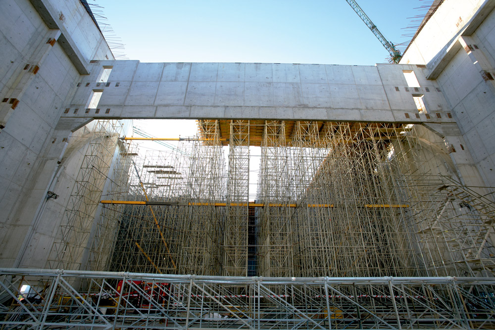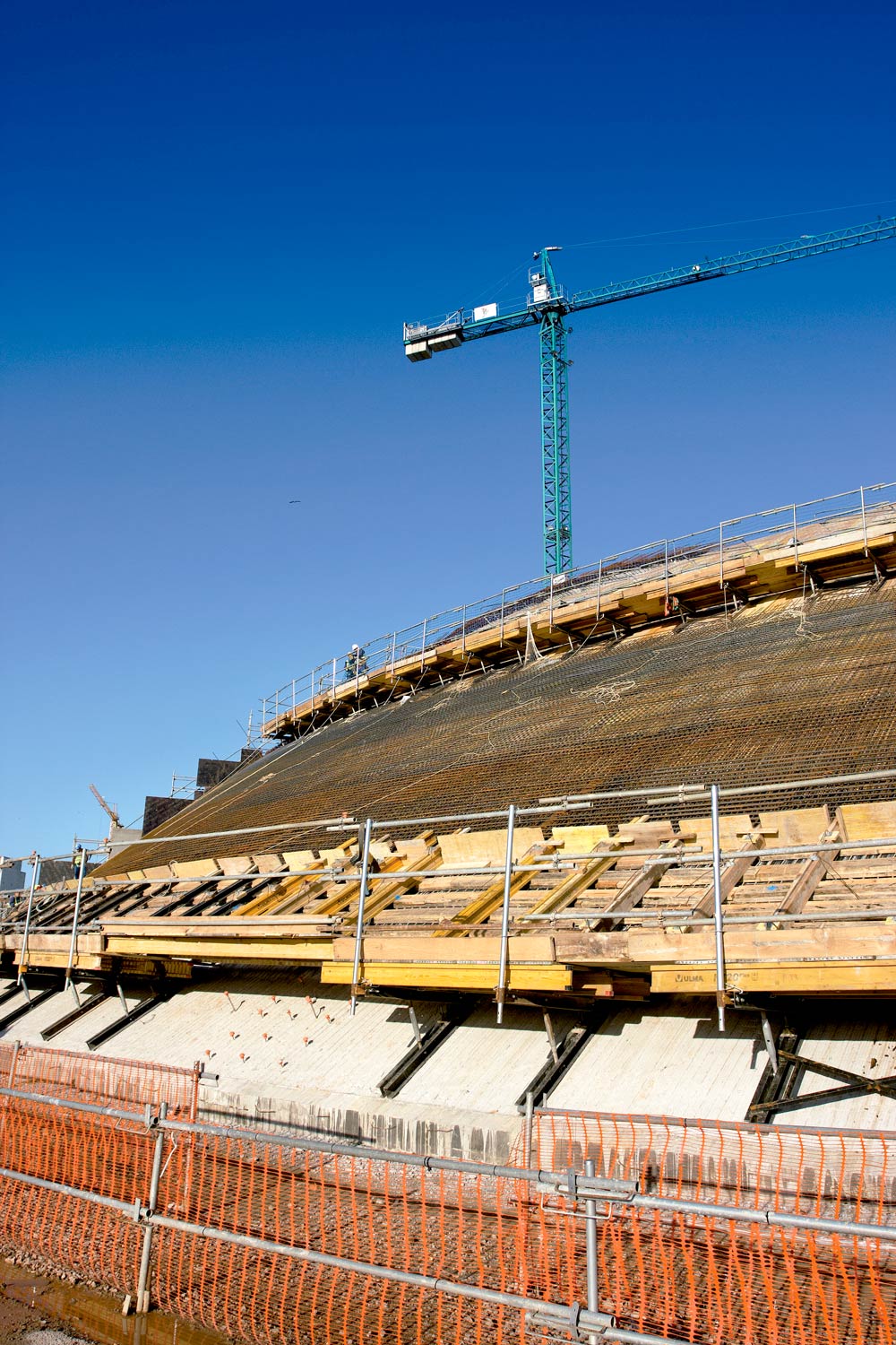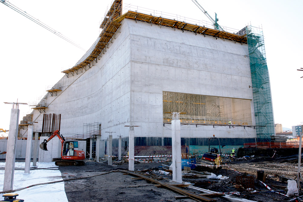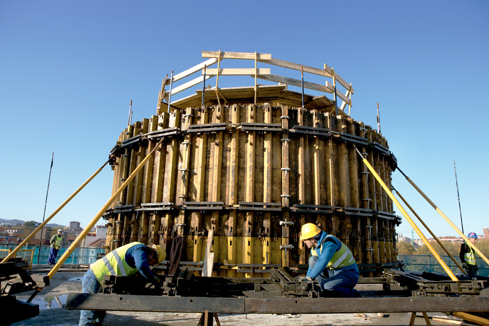 La silhouette ondeggiante degli edifici ha richiesto un'attenta analisi al fine di realizzazione pareti con una geometria diritta e curva e garantendo una perfetta finitura del calcestruzzo a vista. La cassaforma modulare ORMA ha consentito di eseguire le pareti diritte, mentre per le pareti curve con geometria variabile è stato utilizzato il sistema ENKOFORM V-100. In questo modo si sono potuti sfruttare al meglio entrambi i prodotti, grazie alla possibilità di unirli con una stessa morsa. La superficie della cassaforma in multistrato ha consentito di ottenere la finitura richiesta.
