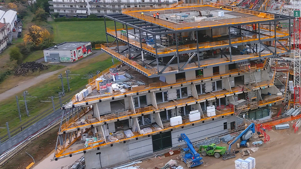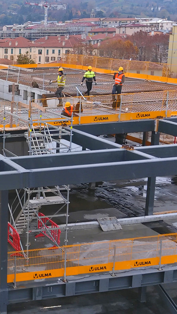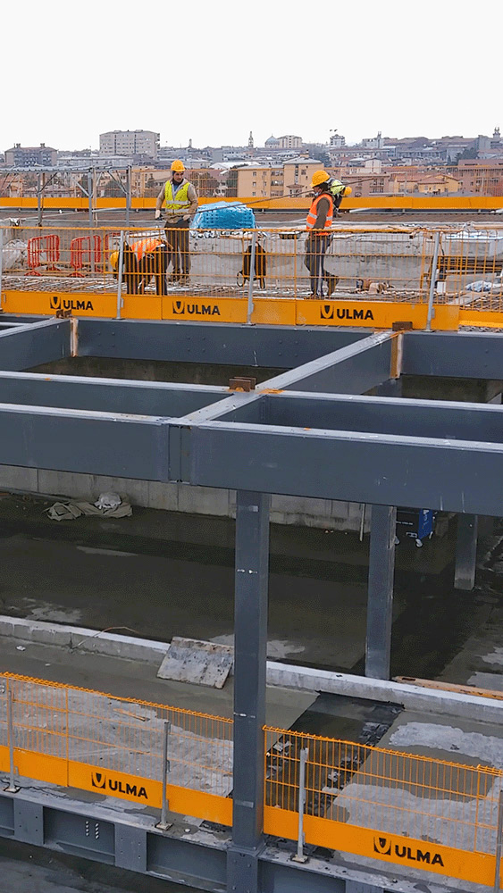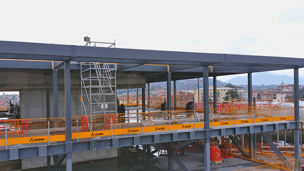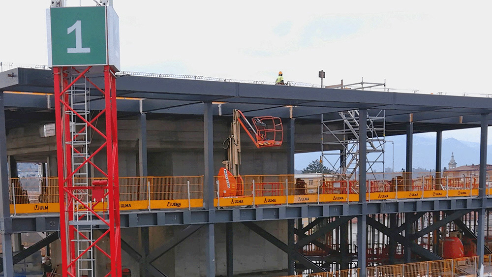 La soluzione ULMA, con il suo innovativo sistema di protezione perimetrale (chiamato scudo) e realizzato con travi MK, ha permesso di velocizzare notevolmente le lavorazioni e soprattutto, di operare in totale sicurezza senza l’ausilio di ponteggio, difficilmente adattabile ai dislivelli del cantiere.