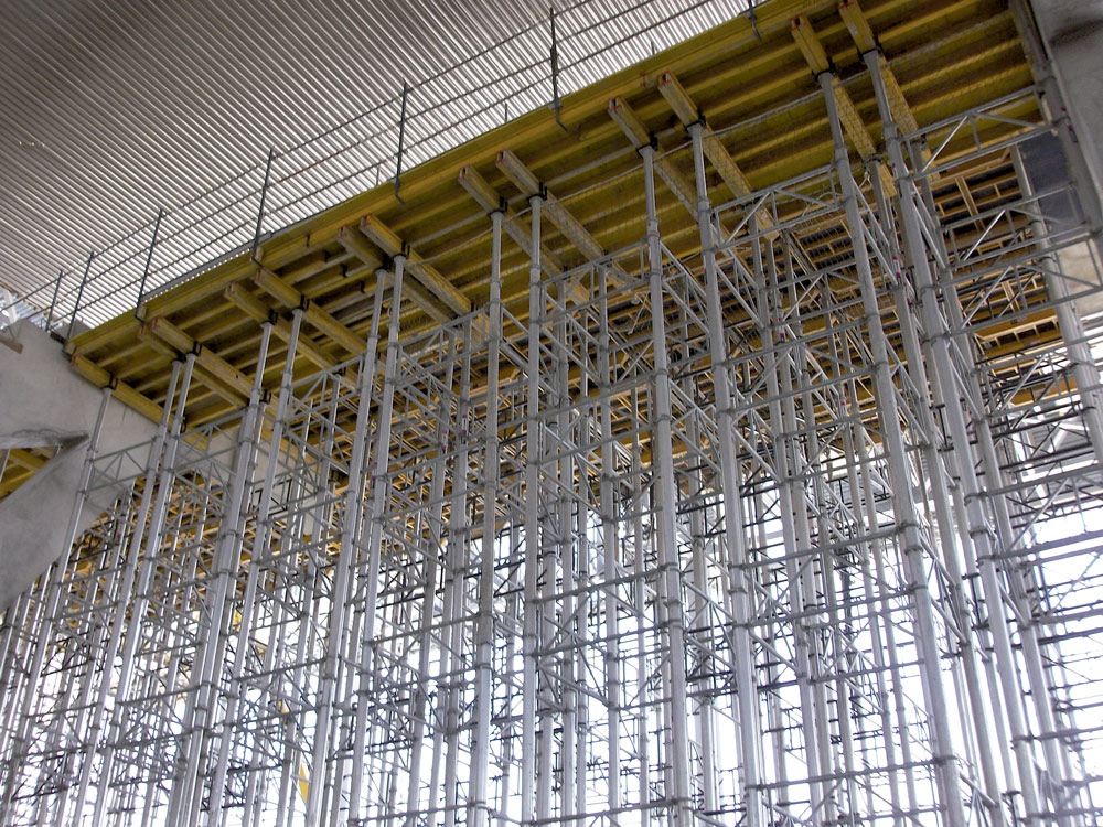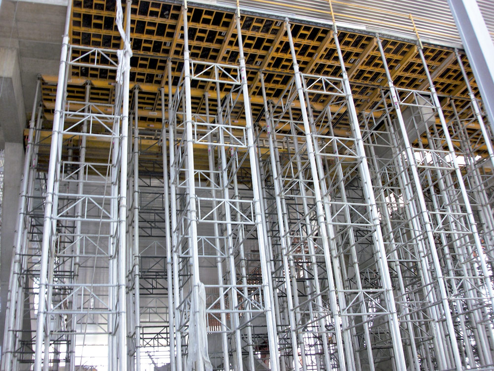 Per raggiungere l'altezza di 8m prevista dal progetto, sono stati utilizzati puntelli in alluminio ALUPROP disposti in configurazione a torre. Le prestazioni di questo prodotto, impiegato per la realizzazione dei solai, sono state potenziate dalla possibilità di lasciare assemblate le torri da 100m3, poiché erano movimentabili senza smontaggio dopo l’uso. In questo modo, è stato possibile riutilizzare i materiali e ridurre i tempi di esecuzione dei lavori poiché si è evitato il continuo assemblaggio e smontaggio delle attrezzature.