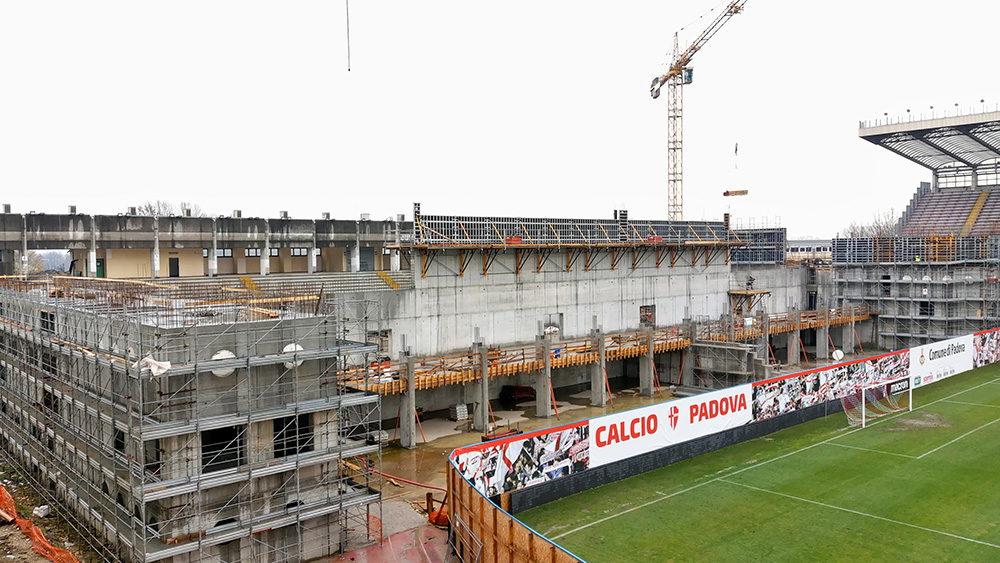 La curva sud, la cui capienza è stata aumentata rispetto al progetto iniziale, avrà 26 gradoni e 3.300 posti, con una copertura trasparente per consentire al sole di filtrare e di scaldare il campo. Alle spalle ci saranno i due palazzetti da mille posti a sedere ciascuno. La nuova capienza dell'Euganeo per il calcio, una volta finito il primo stralcio, sarà di 28.000 posti in “versione stadio” 42.000 posti per la “versione concerto.”
