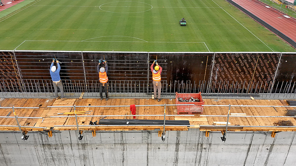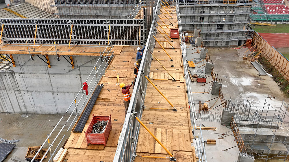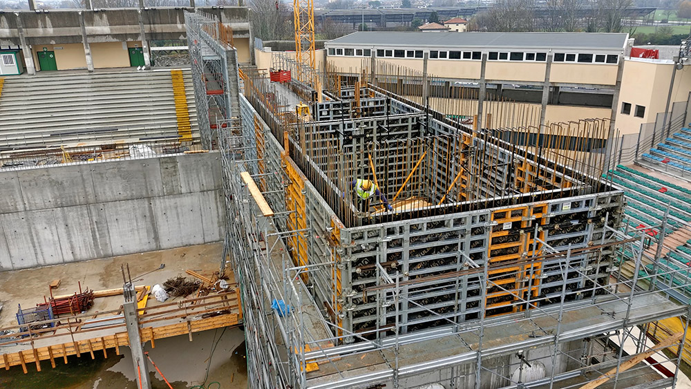Con l’ausilio dei pannelli ORMA sono stati gettati i vani scala, con il sistema CC4 i diversi solai dei vani e, grazie alla praticità del sistema rampante BMK, composto da traverse standard MK, accessori specifici BMK e altri dispositivi del sistema MK, è stata realizzata con praticità la parete di sostegno delle gradinate. Con un totale di 54 mensole è stato possibile realizzare la struttura con 3 getti in pianta e 7 conci in altezza.
