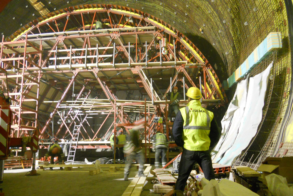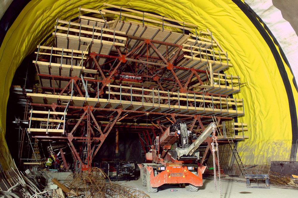 Per la galleria STT, quella con maggiore densità di traffico, sono stati utilizzati carri per cordolo per la realizzazione delle pareti dei condotti di ventilazione sotto il pavimento. L'uso di unità di casseforme preassemblate ha reso ancor più semplice la loro movimentazione. ENKOFLEX è stato il sistema utilizzato per i solai.