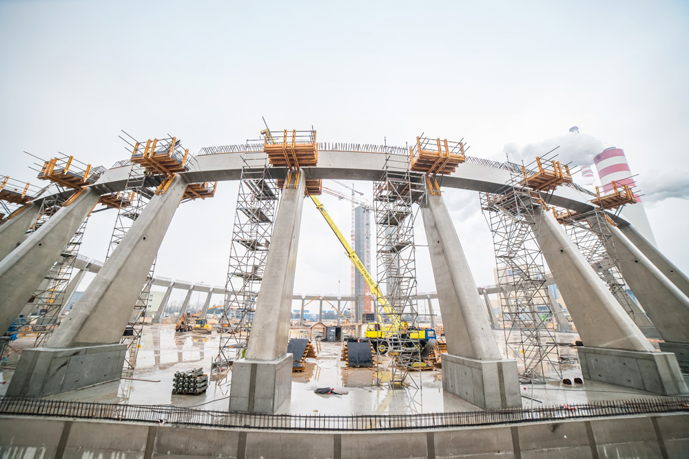 Il progetto include una tubazione sotterranea per l'acqua calda larga 4m e alta 2,7m che va dal perimetro della torre verso il centro dove raggiunge un'altezza di 20m. Le pareti sono state realizzate con la cassaforma ORMA, mentre il perimetro del tetto con tavole VR di due diverse dimensioni: 150 x 270cm e 150 x 360cm facili da movimentare e adattabili ad ogni area.