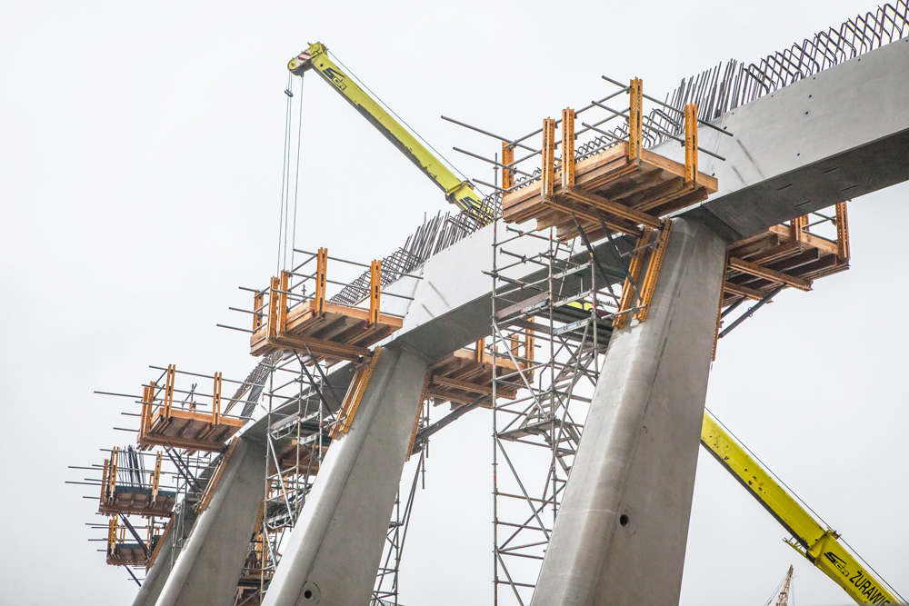 A 13m di altezza, la costruzione della trave circolare realizzata con travi prefabbricate, ha richiesto uno spazio di lavoro sufficiente per eseguire la giunzione dei diversi segmenti. Le piattaforme di lavoro di 2,25 x 2,65m con il sistema MK hanno facilitato il getto tra le travi.
