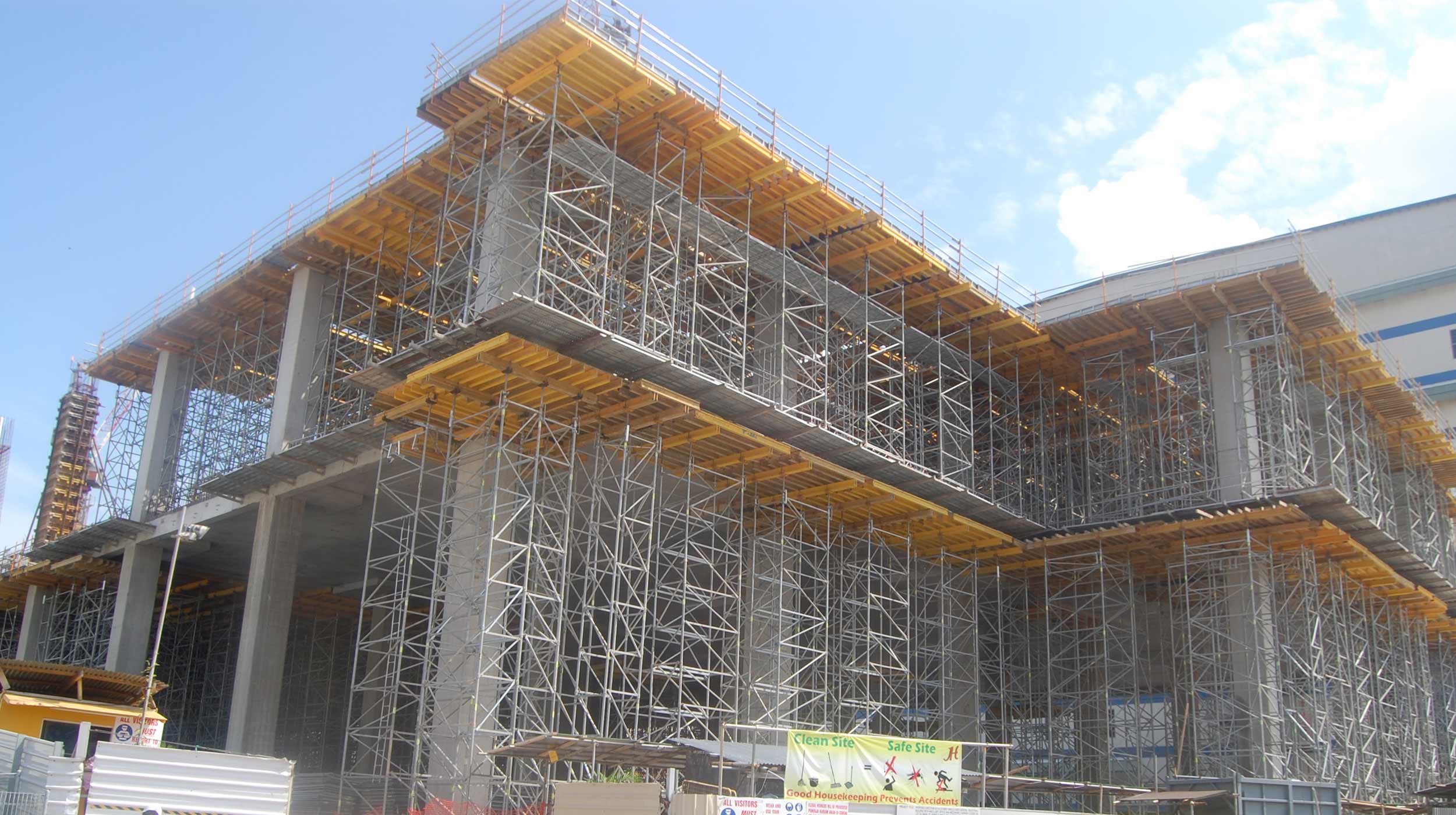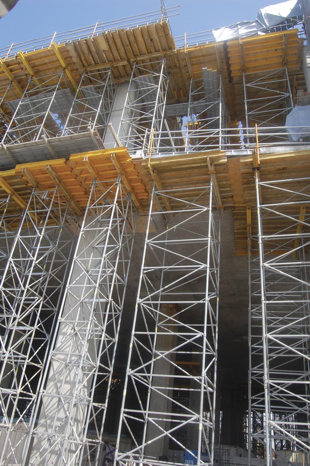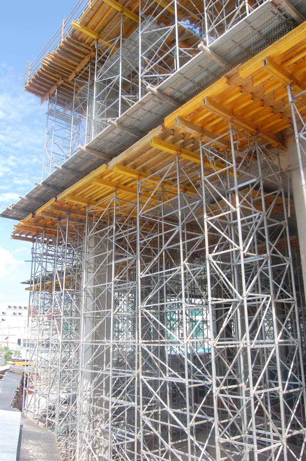 I solai da 750mm e le testa-pila sono state costruite con tavole VR. La grande altezza ha richiesto puntellazioni T-60 in diverse modulazioni (1m, 1,5m e 2m).
