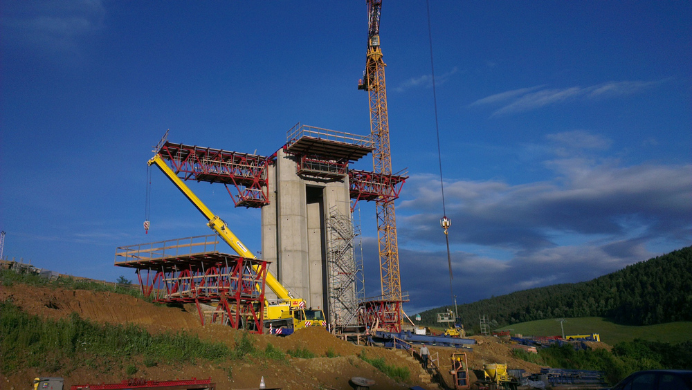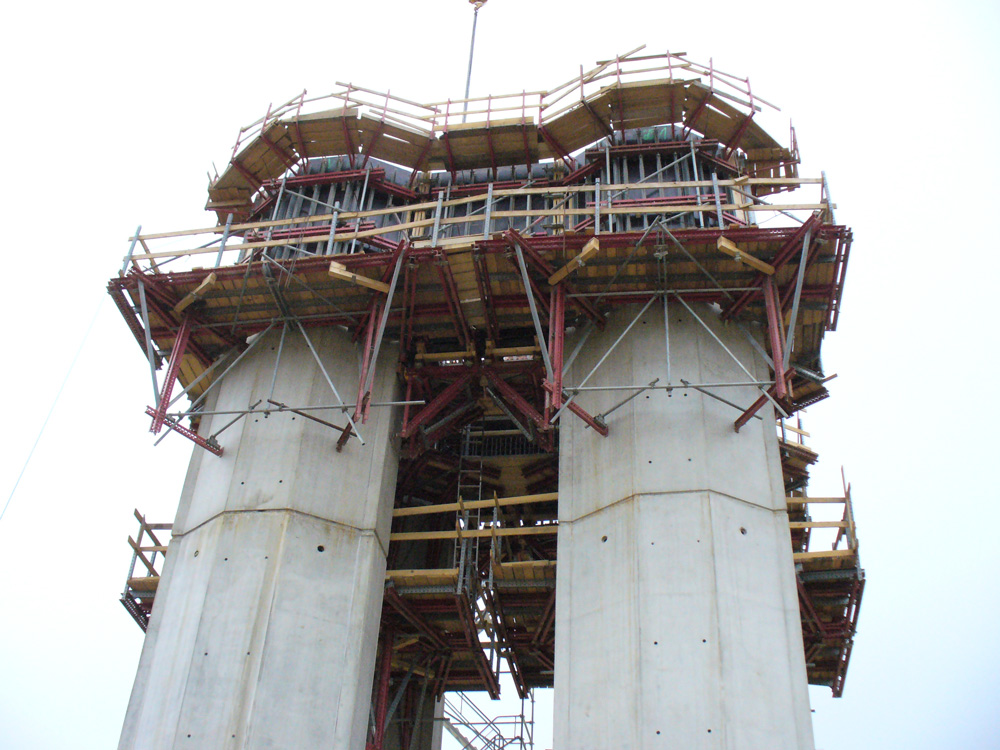 Le pile, le spalle e il segmento stesso delle pile, sono stati realizzati con casseforme modulari MK. La struttura di supporto per la costruzione delle pareti di sostegno, le mensole di sostegno MK e il sistema rampante, sono stati adattate alla geometria delle pile.