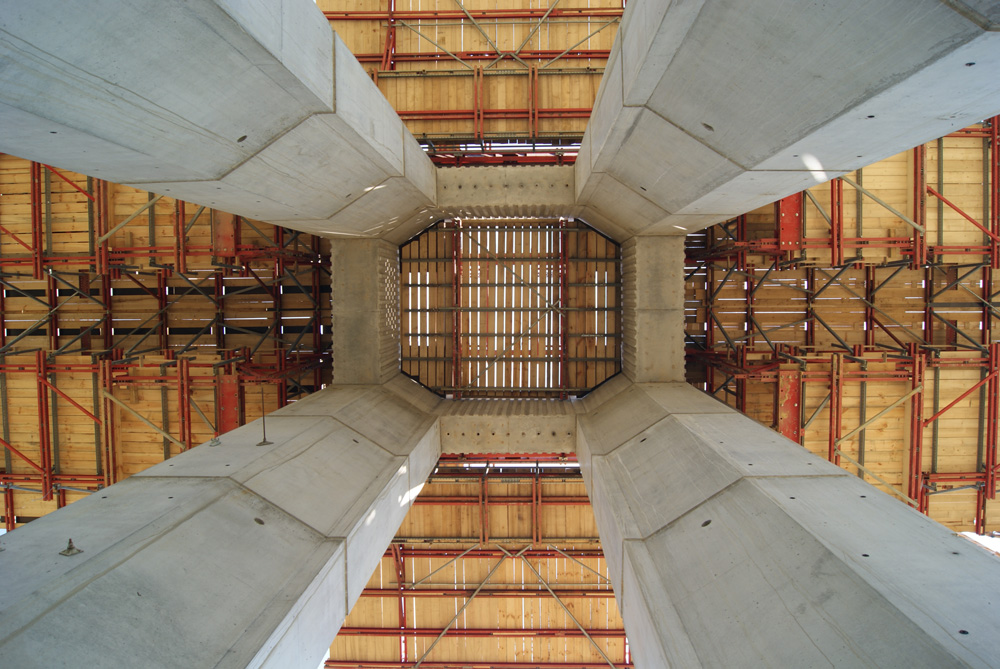 Secondo quanto prescritto dalle norme di sicurezza, sono state installate altre piattaforme tra i pilastri per garantire la sicurezza degli operai in tutte le fasi del processo costruttivo.