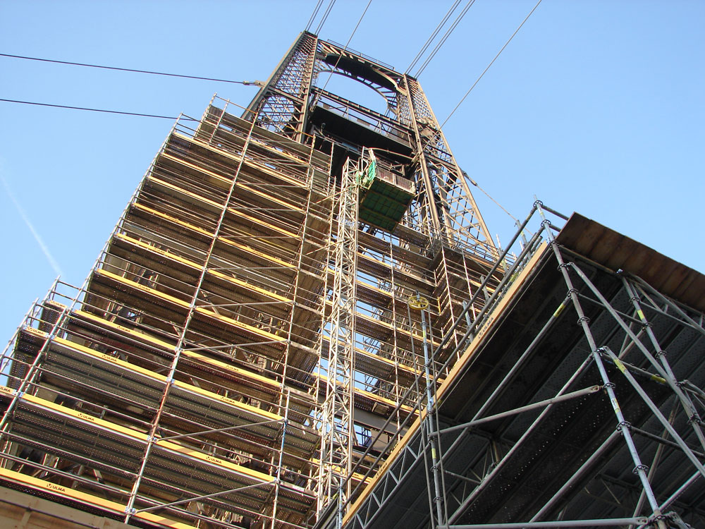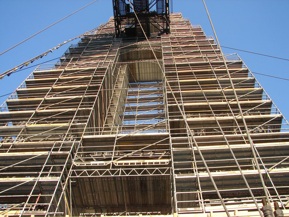 La struttura è stata completamente ricoperta da ponteggi modulari BRIO. 800t di materiale distribuito su 4 torri da 68m e lungo la struttura di ferro lunga 162m. Il ponteggio per le torri è stato poggiato al suolo, mentre quello sospeso per la struttura orizzontale è stato agganciato ad una trave.
