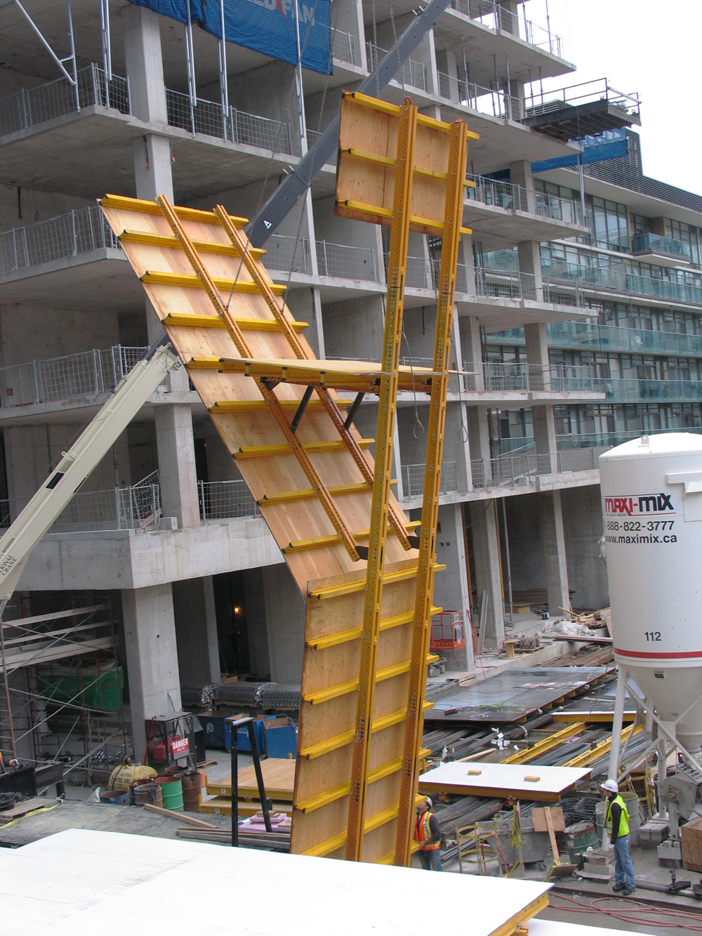 I pannelli inclinati con integrate le piattaforme di stoccaggio materiale, sono stati impiegati per il trasferimento del materiale al piano successivo dopo l'uso. Una centralina idraulica mobile ha consentito di evitare l'utilizzo di gru per la rampatura dei pannelli e di altri materiali con conseguenti risparmi di tempo e denaro.