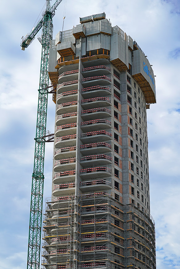 Essendo in un'area esposta al vento, la gru doveva essere disponibile in ogni momento. Pertanto, i sistemi autorampanti ATR, RKS e gli schermi di protezione perimetrale HWS hanno svolto un ruolo essenziale nell'intero processo, con cicli settimanali per piano.