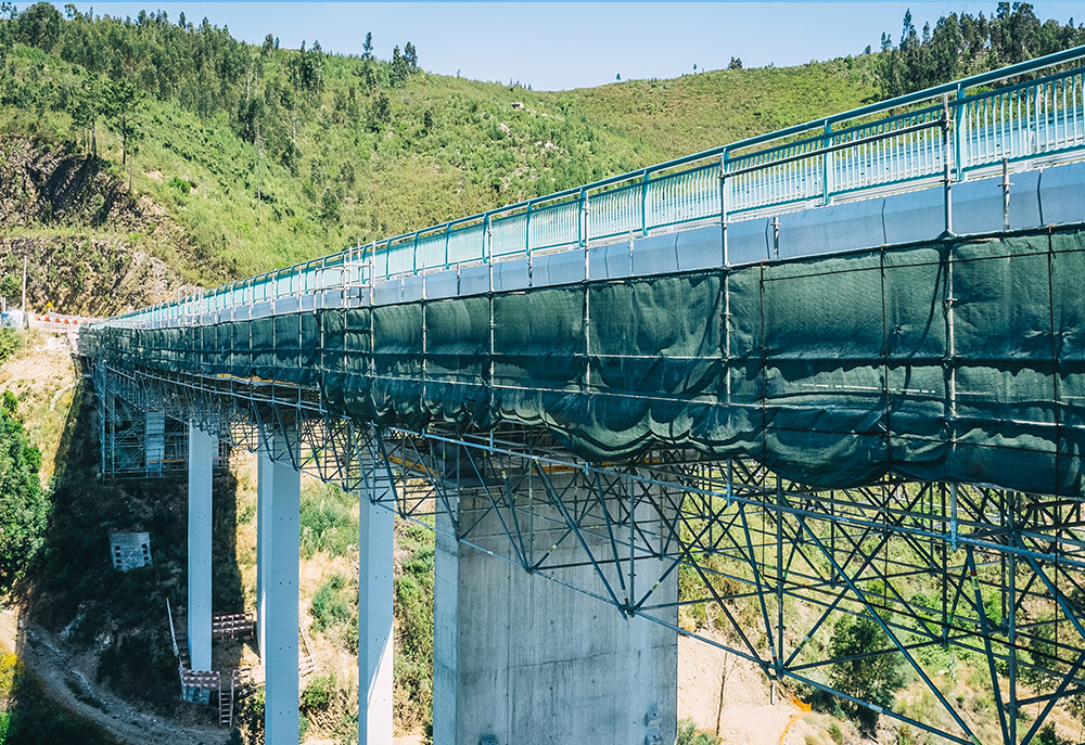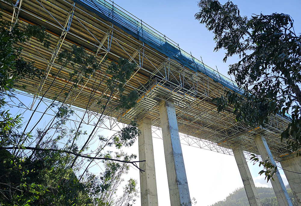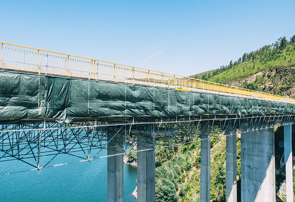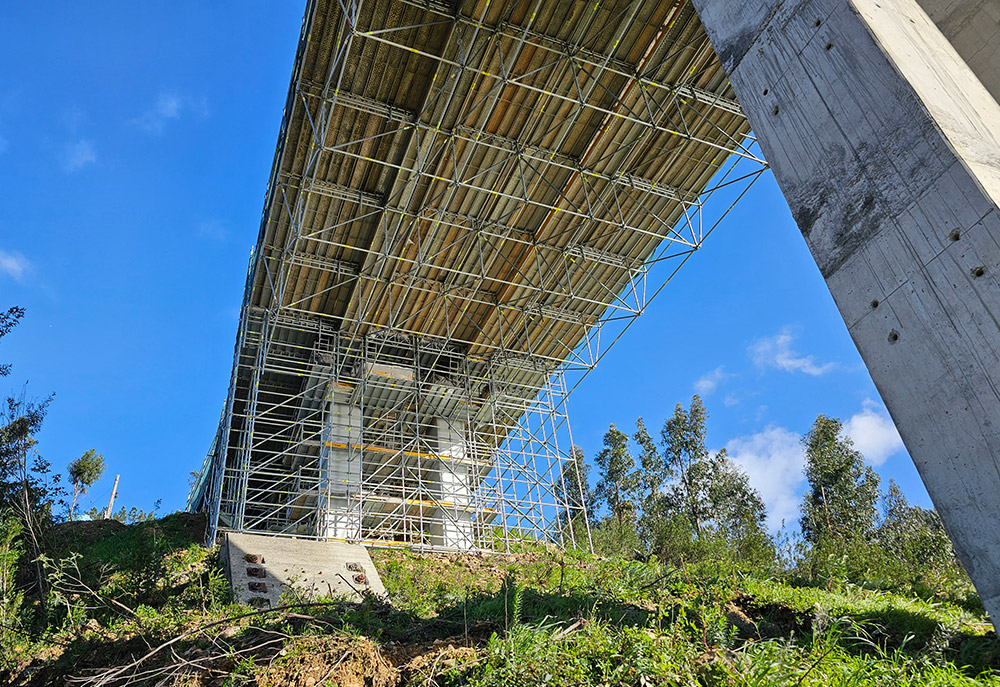 La soluzione sviluppata da ULMA è consistita in una piattaforma di lavoro continua, composta da ponteggio multidirezionale BRIO in sporgenza e sospeso dall'impalcato del ponte. Questa piattaforma, larga 12 metri e distesa su 19 campate di circa 20 metri di lunghezza, ha fornito accesso totale a tutte le zone di intervento senza interrompere la circolazione. Inoltre, ULMA ha progettato e fornito soluzioni di casseforme su misura per l'esecuzione di travi di bordo e strutture in cemento armato associate al rinforzo del ponte.