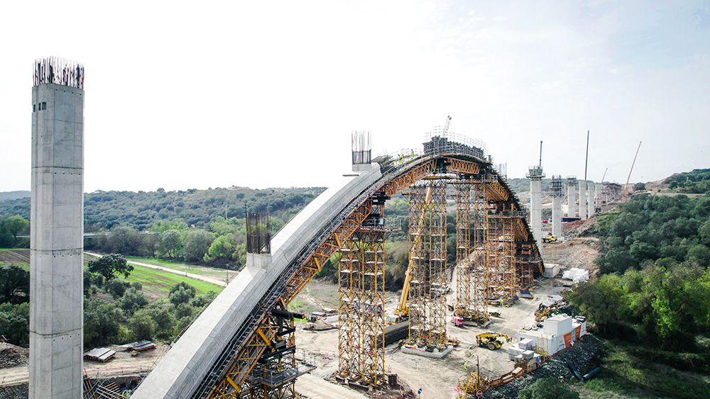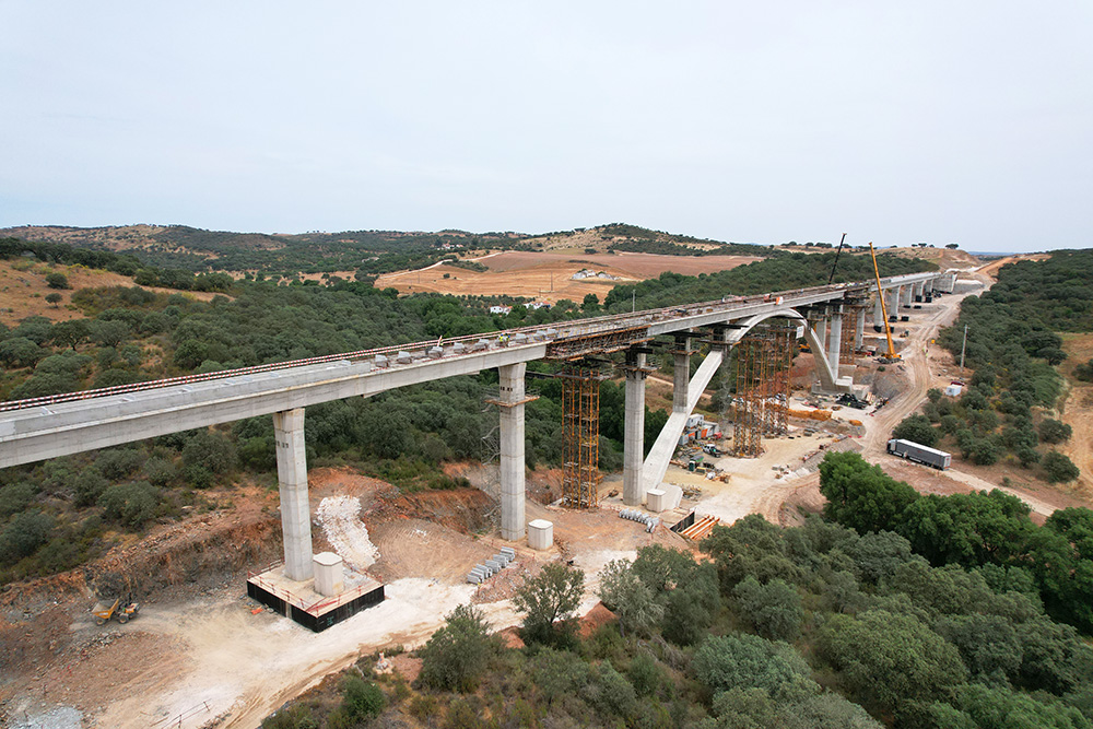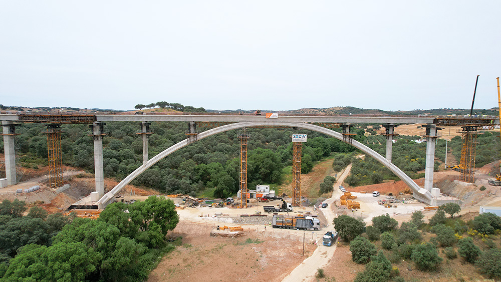 "La parte più complessa della costruzione di questo viadotto è sicuramente l'arco. Dovuto al suo processo costruttivo, abbiamo adattato il sistema di torri T-500, di grande tonnellaggio, con travi H-33 che consentono di colmare grandi campate. In questo modo, abbiamo posizionato queste torri nei luoghi ideali per posizionare martinetti idraulici che ci permettessero di correggere le altezze dei due semiarchi. Infine, abbiamo realizzato una trave centrale in cui l'arco viene tensionato e compresso in modo da poter essere controventato senza problemi di introduzione di carichi non previsti", commenta Nuno Filipe, Direttore dei Lavori, Construgomes Engenharia.